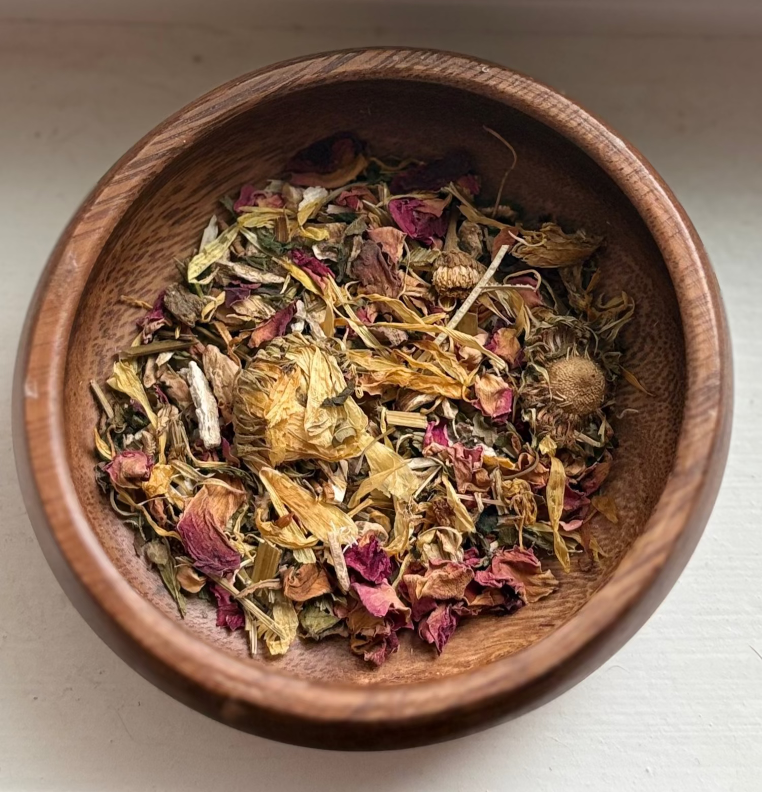 Nettle leaf, calendula, red clover, burdock root, rose petals, spearmint